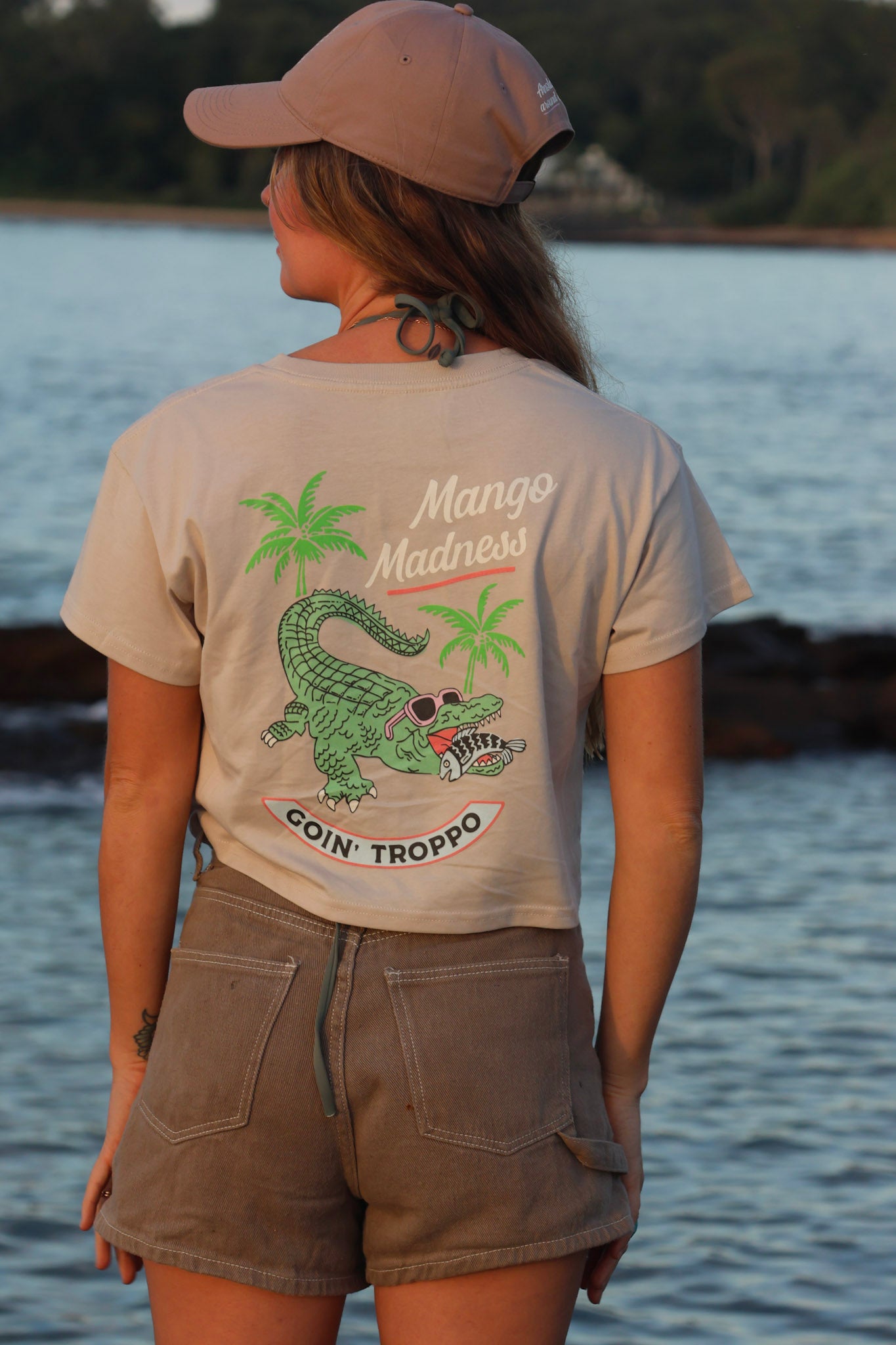 Feelin’ the heat? Go full mango madness in our GOIN’ TROPPO Cropped Tee in Bone – a top-end essential for when the build-up’s got you sweatin’, snackin’ mangoes, and dodging cranky crocs in sunnies.