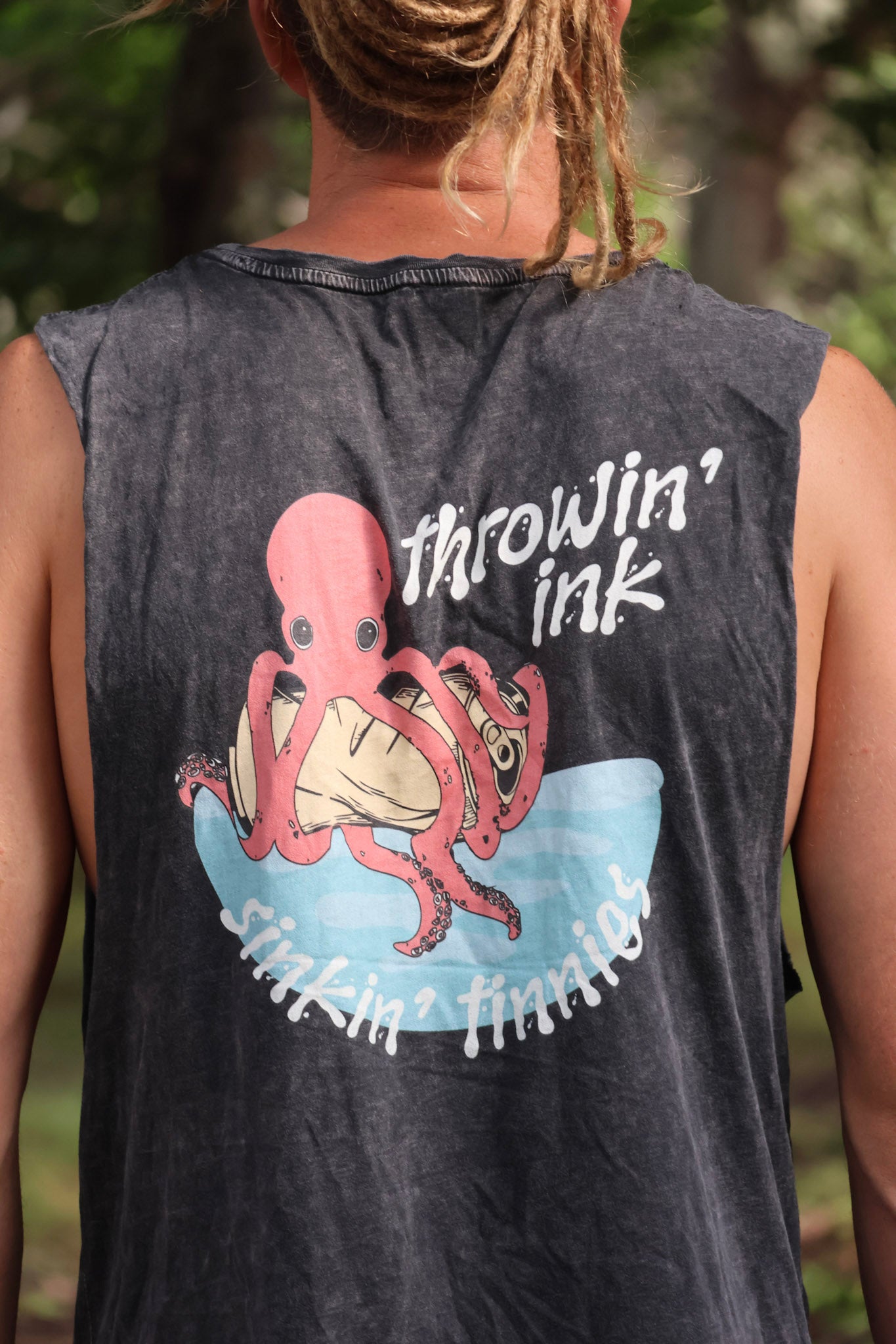 The INKED & SINKED Stone Wash Tank in Black brings the chaos of the catch to your wardrobe – featuring our rogue squid mid-ink blast, crushin’ a can like it’s earned knock-off o’clock. It’s cheeky, salty, and 100% designed for days spent on the water (or daydreaming about it).